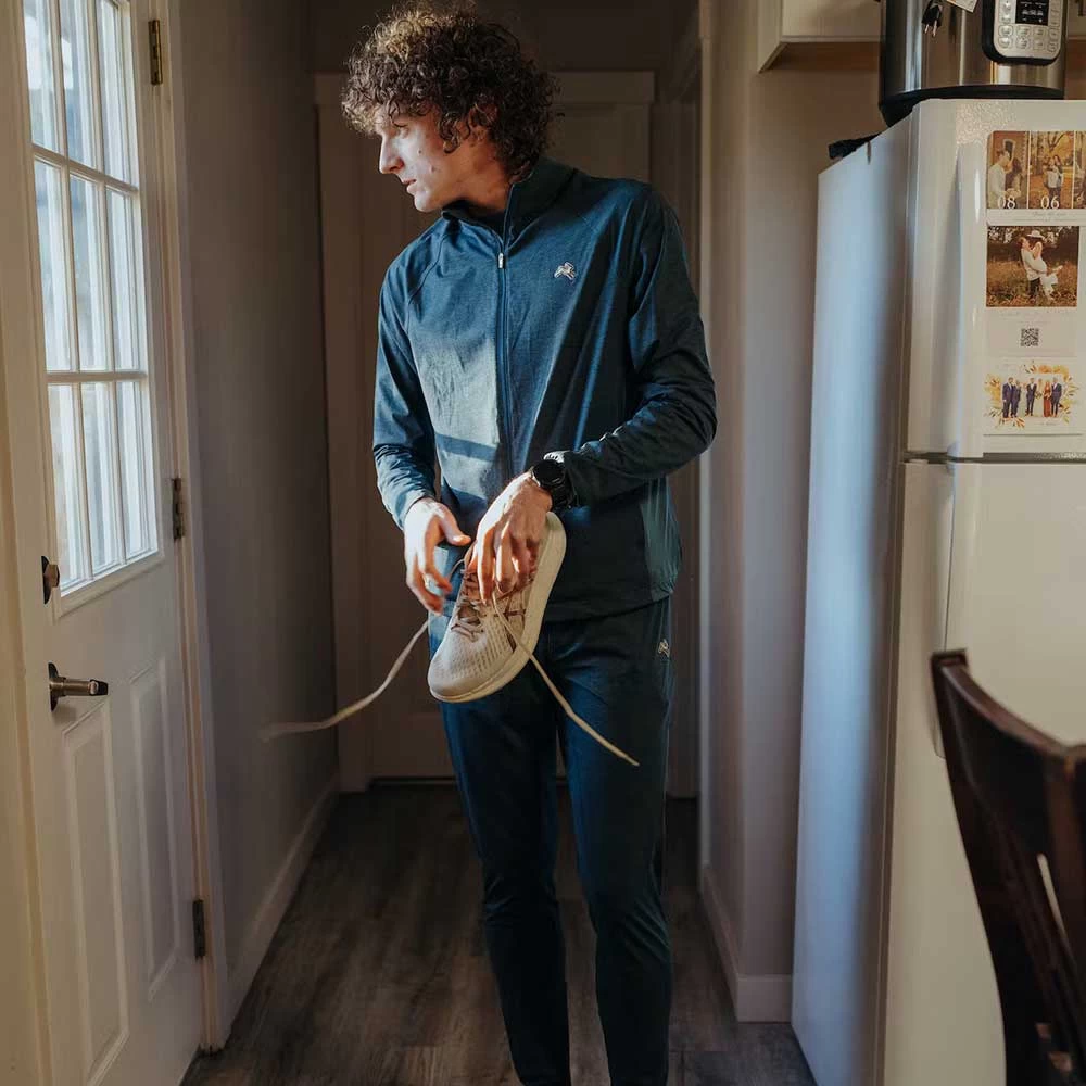 We started with Veloce fabric, a stretch knit made in Northern Italy by the masters of luxury performance textiles. It’s an 86% Nylon, 14% Elastane blend. It may sound complex, but the results are simple. It’s lightweight and durable, silky smooth, and performs under intense activity. It also breathes well, dries quickly, and insulates without risk of overheating – ideal for long runs that start cold and end warm, or warm-ups that start slow and end fast.