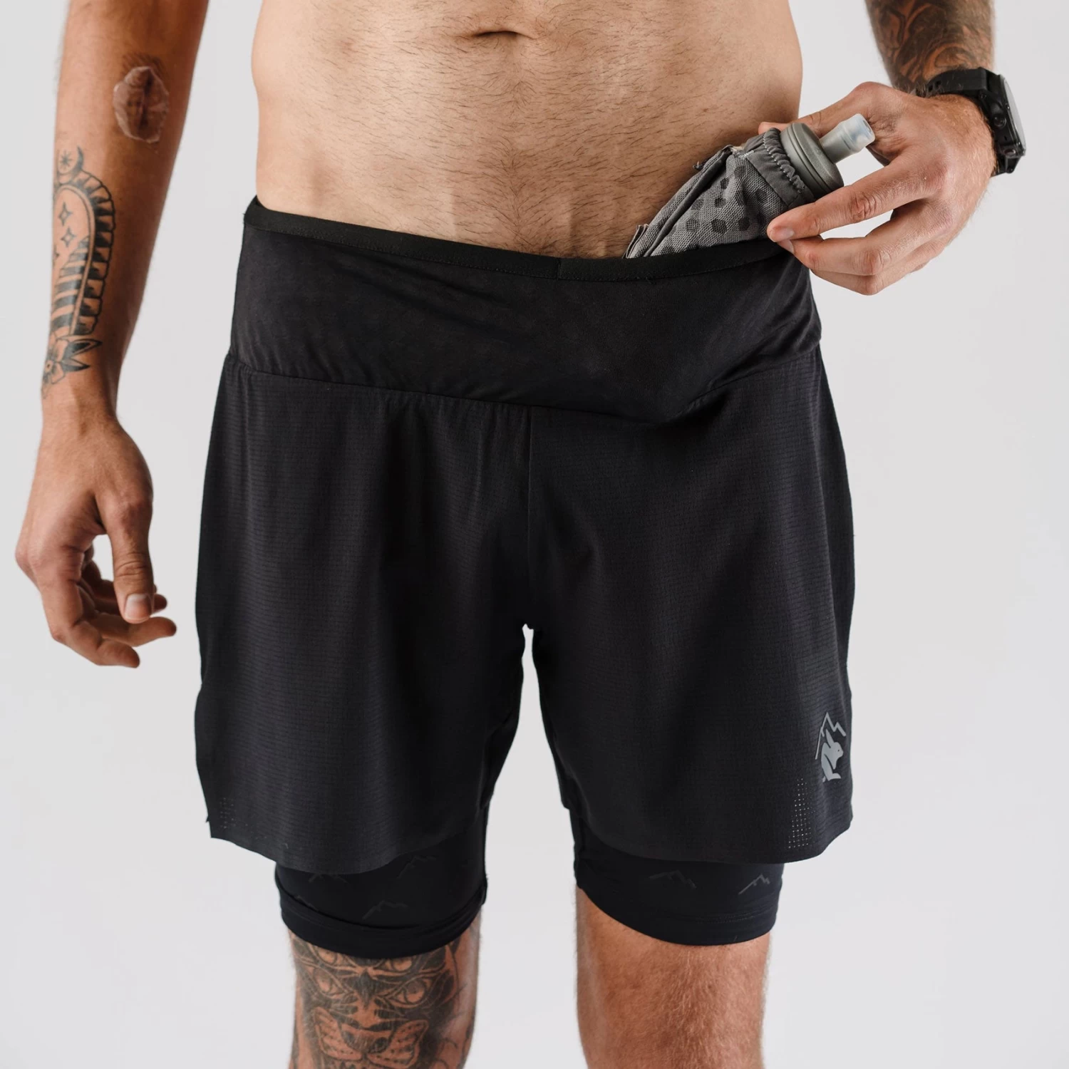 The ultimate 2-in-1 trail shorts featuring built-in storage around the entire waistband, 6 pockets to be exact. Back center zip pocket large enough to carry most phones. Built-in compression liner with external silicone grippers to support power hiking. Internal drawcord for secure fit. Woven is 86% polyester and 14% spandex with perforations throughout for max ventilation. Bonded seaming for speed. Waistband is rabbitKNIT ICE which is cool to the touch, fast drying, and odor-controlling. 5” inseam.