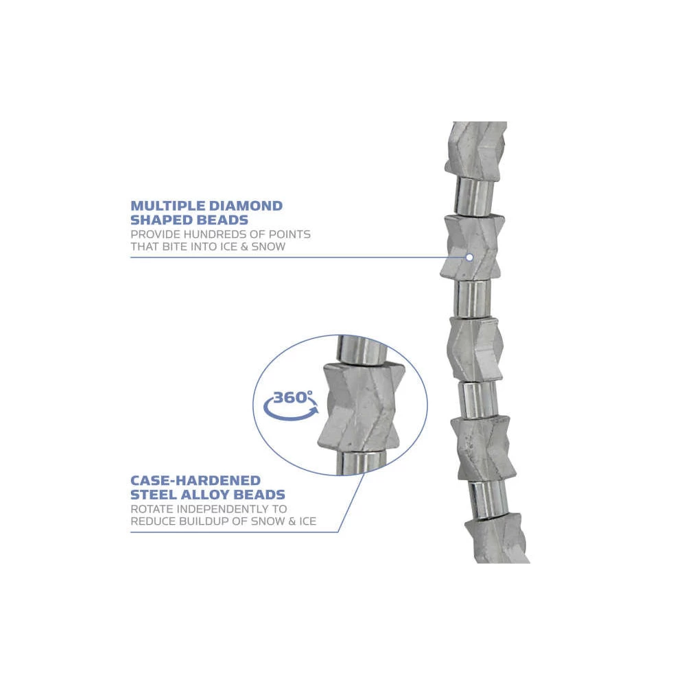 The patented diamond shaped beads have hundreds of biting edges that grip in all directions. Made of case-hardened steel alloy and strung on steel aircraft grade cable, they are extremely durable and are ideal for those who frequently encounter transitional surfaces such as rock, gravel, dirt, and bare concrete.